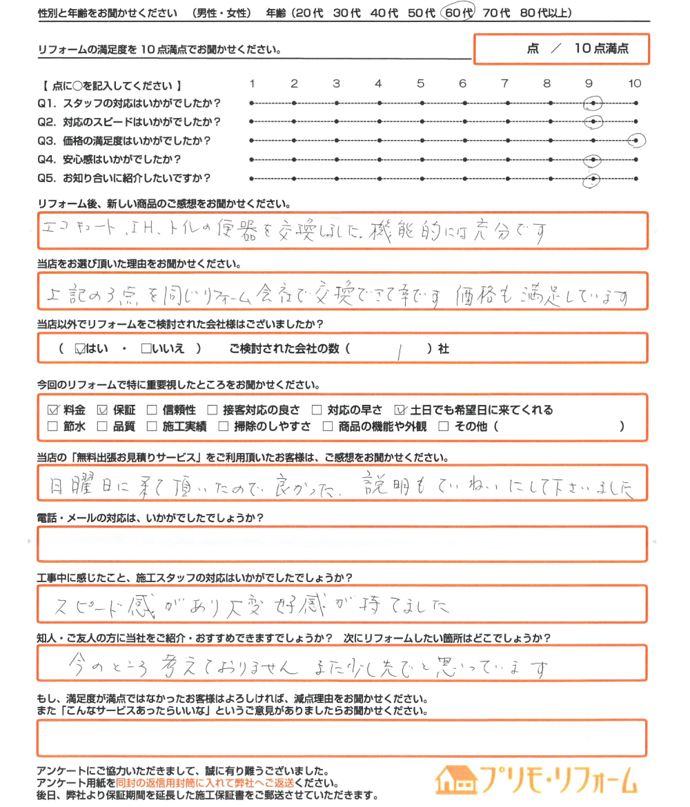 直筆のアンケートリフォーム情報施工日:2021年4月14日場所:加西市リフォーム内容:エコキュート・IH・トイレ交換使用したモデル:お客様情報性別・年齢: (60代)リフォームの満足度9点/10点満点中アンケートの内容 ...
