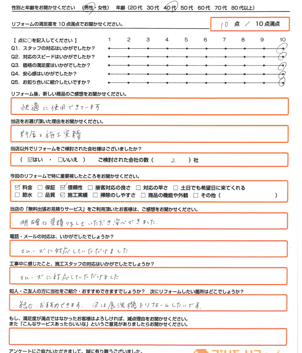 直筆のアンケートリフォーム情報施工日:2021年1月9日場所:加古郡リフォーム内容:電機温水器からエコキュート取替使用したモデル:お客様情報性別・年齢:男性 (40代)リフォームの満足度10点/10点満点中アンケートの内 ...