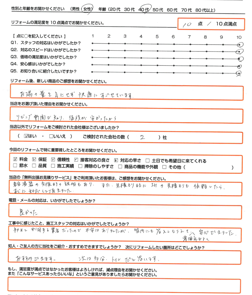 直筆のアンケートリフォーム情報施工日:2020年11月5日場所:加西市リフォーム内容:エコキュート・IH交換使用したモデル:お客様情報性別・年齢:女性(40代)リフォームの満足度10点/10点満点中アンケートの内容リフォ ...