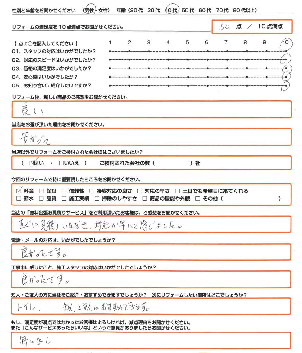 直筆のアンケートリフォーム情報施工日:2020年6月29日場所:神河町リフォーム内容:エコキュート交換使用したモデル:お客様情報性別・年齢:女性(50代)リフォームの満足度10点/10点満点中アンケートの内容リフォーム後 ...