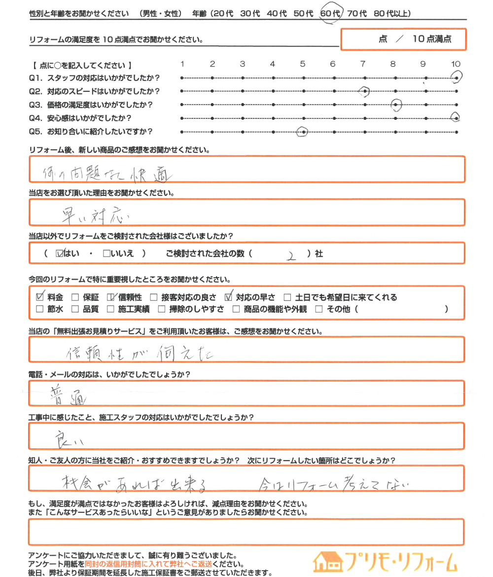 直筆のアンケートリフォーム情報施工日:2021年10月22日場所:小野市リフォーム内容:エコキュート取替使用したモデル:お客様情報性別・年齢: (60代)リフォームの満足度8点/10点満点中アンケートの内容リフォーム後 ...
